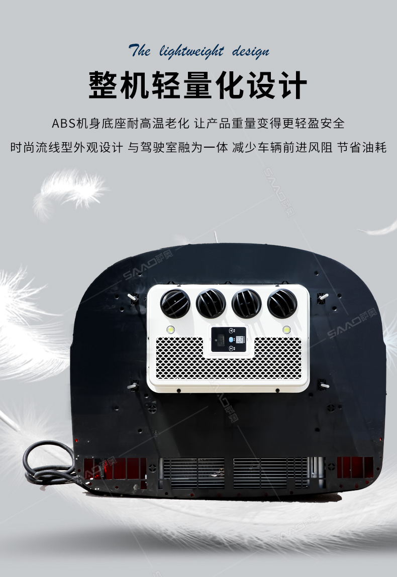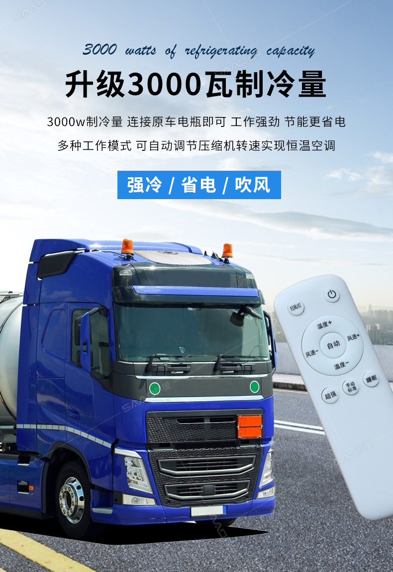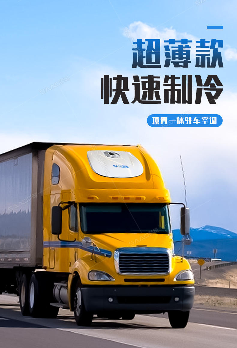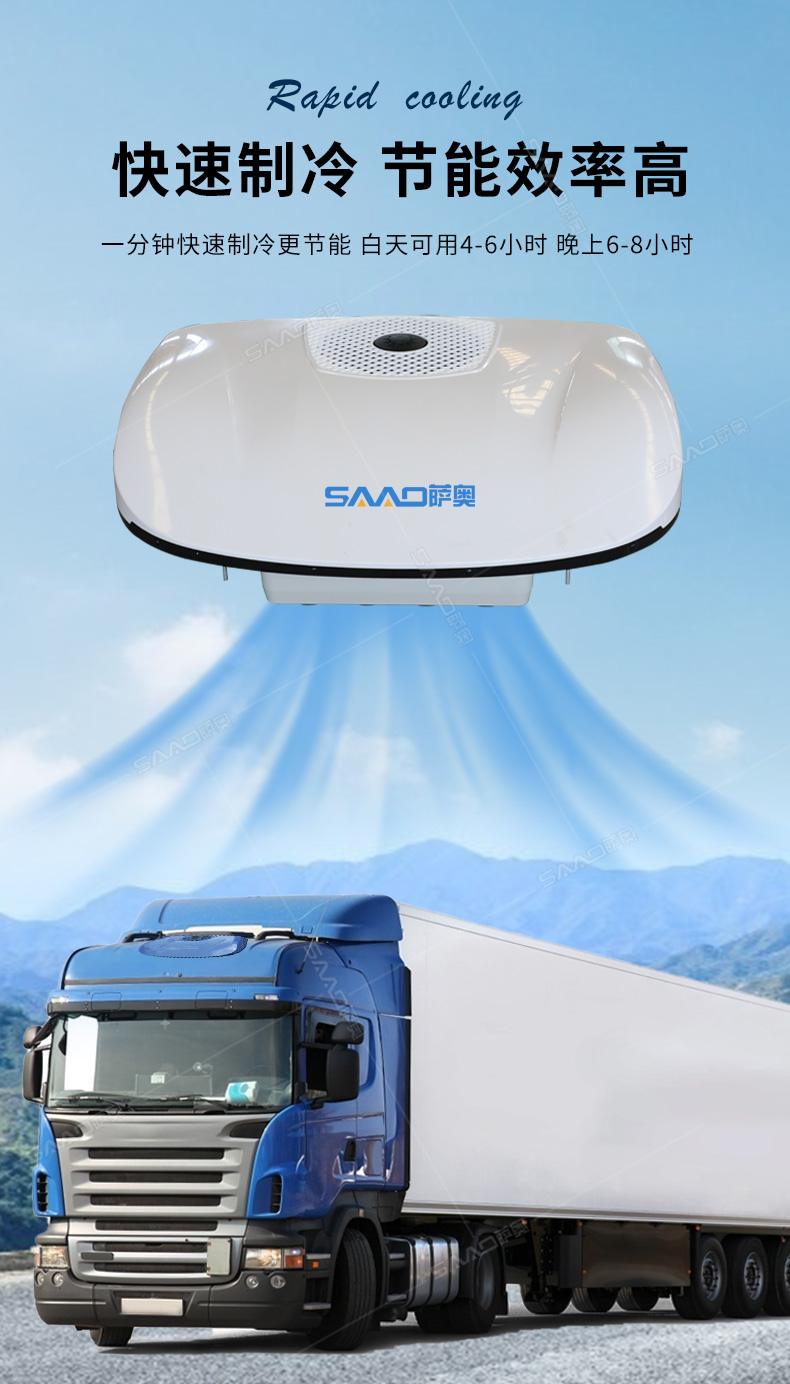 SA-D8000車(chē)載頂置駐車(chē)空調(diào)主要用于卡車(chē)、貨車(chē)等大車(chē)的制冷。一分鐘快速制冷高效節(jié)能,白天可用4-6小時(shí)晚上6-8小時(shí)。