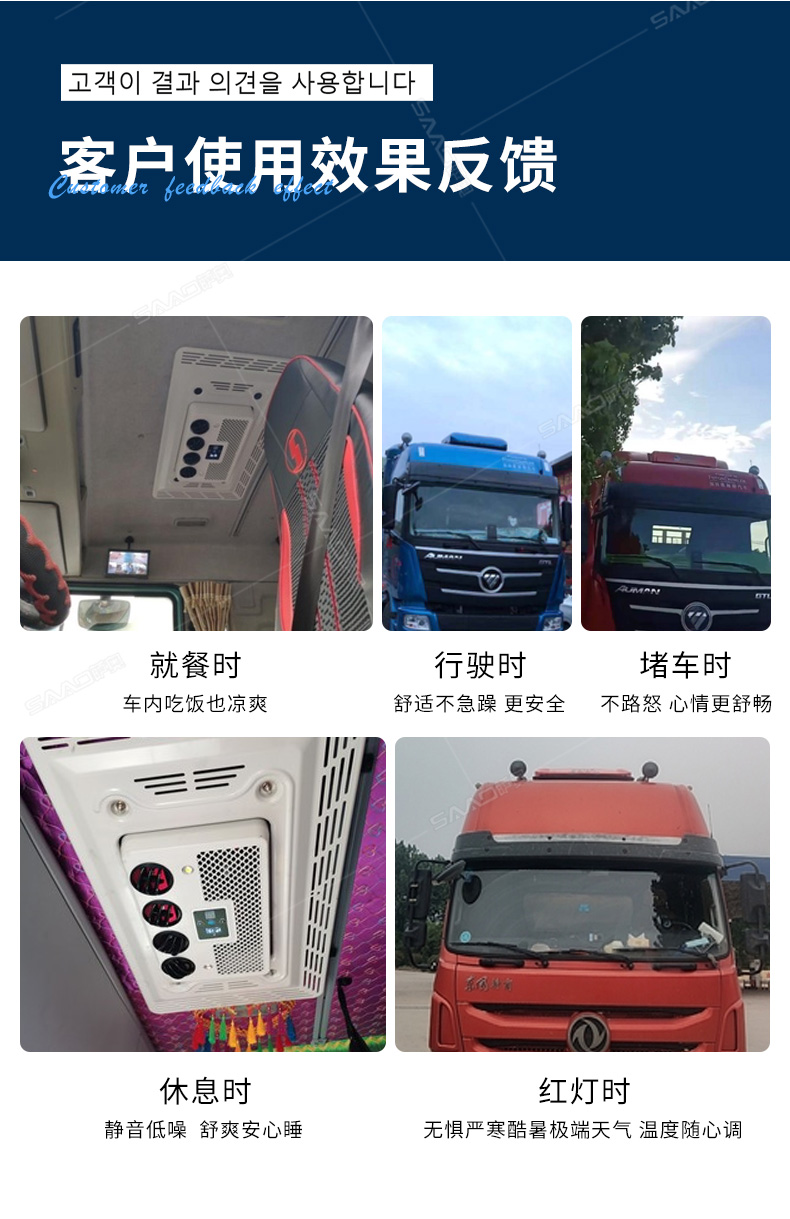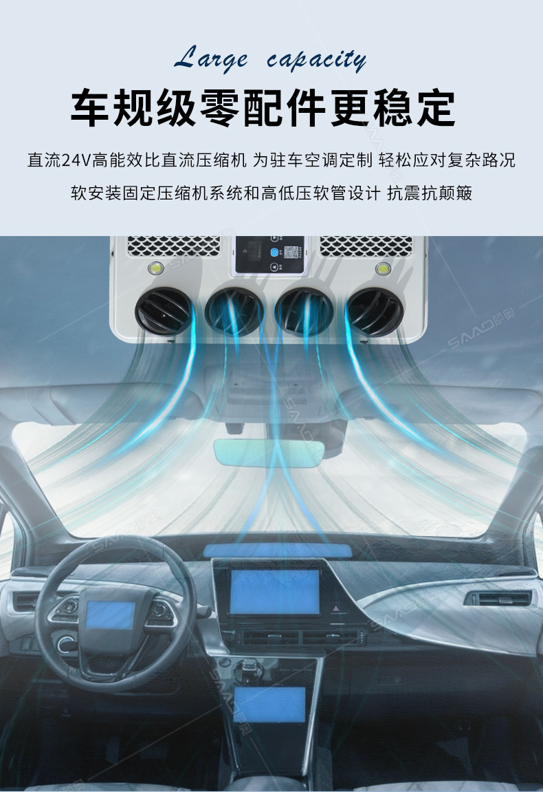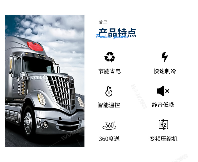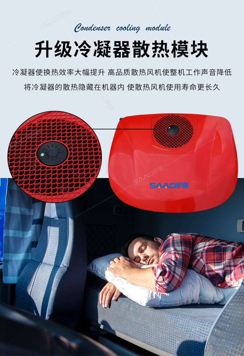 SA-D8000車(chē)載頂置駐車(chē)空調(diào)主要用于卡車(chē)、貨車(chē)等大車(chē)的制冷。一分鐘快速制冷高效節(jié)能,白天可用4-6小時(shí)晚上6-8小時(shí)。