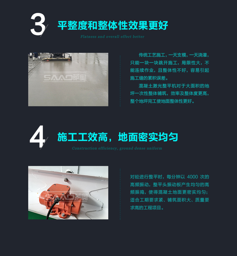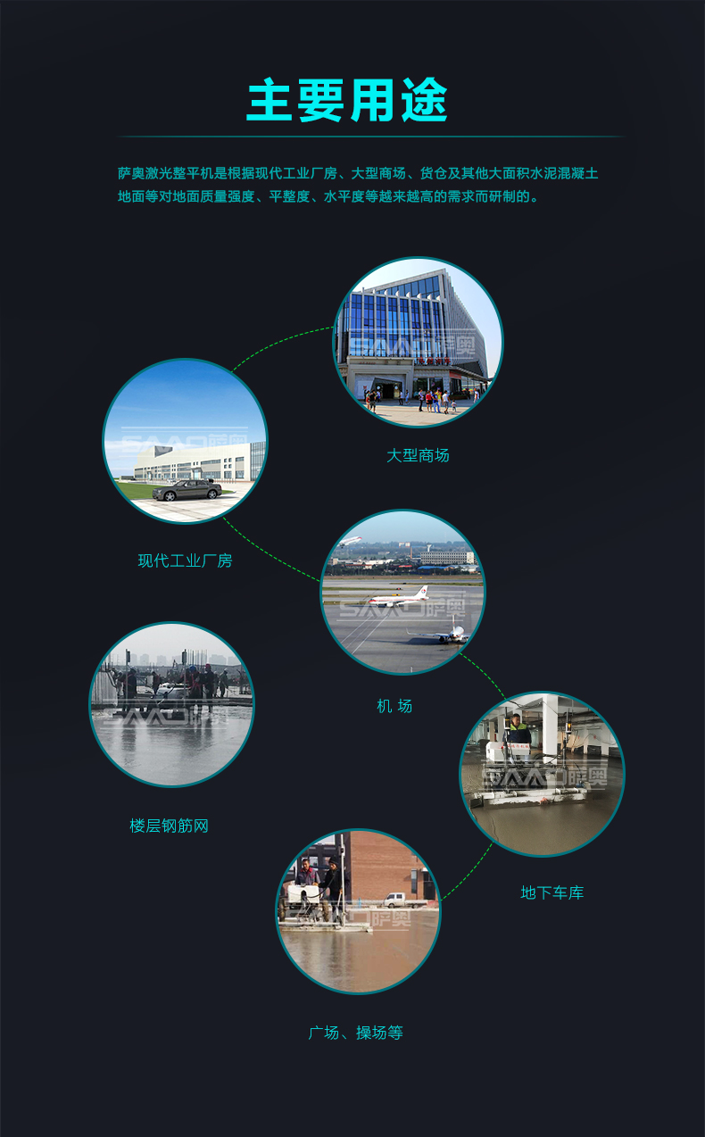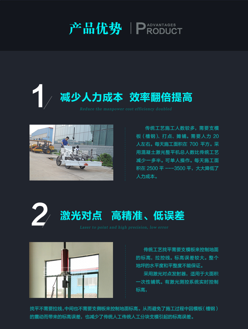 一,應用范圍: 主要用途: 用于現代工業廠房、大型商場、貨場、機場、廣場等大面積混凝土地面的施工,激光攤鋪整平機可滿足對面積大且平整度、水平度要求很好的施工。