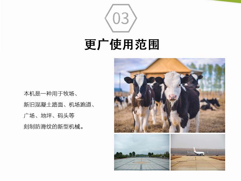 牧場防滑刻紋機為我公司新研制的一款特制的新型產品,該款刻槽機主要適用于養殖場、奶牛場、牛棚、牧業等各類混凝土地面、跑道、廣場、室內刻制防滑紋(兼散水紋)的一款新型機器。紋理排列有序、槽紋表面清晰美觀、操作便捷,是養殖業針對地面防滑的一款新型機械。
