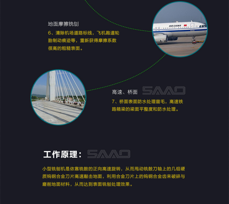 用于橋面鋪設瀝青或車間舊的混凝土地面重新攤鋪混凝土之前,清除水泥浮漿以及鏟平拉毛,也用于清除建筑施工中遺留的堅硬灰渣。