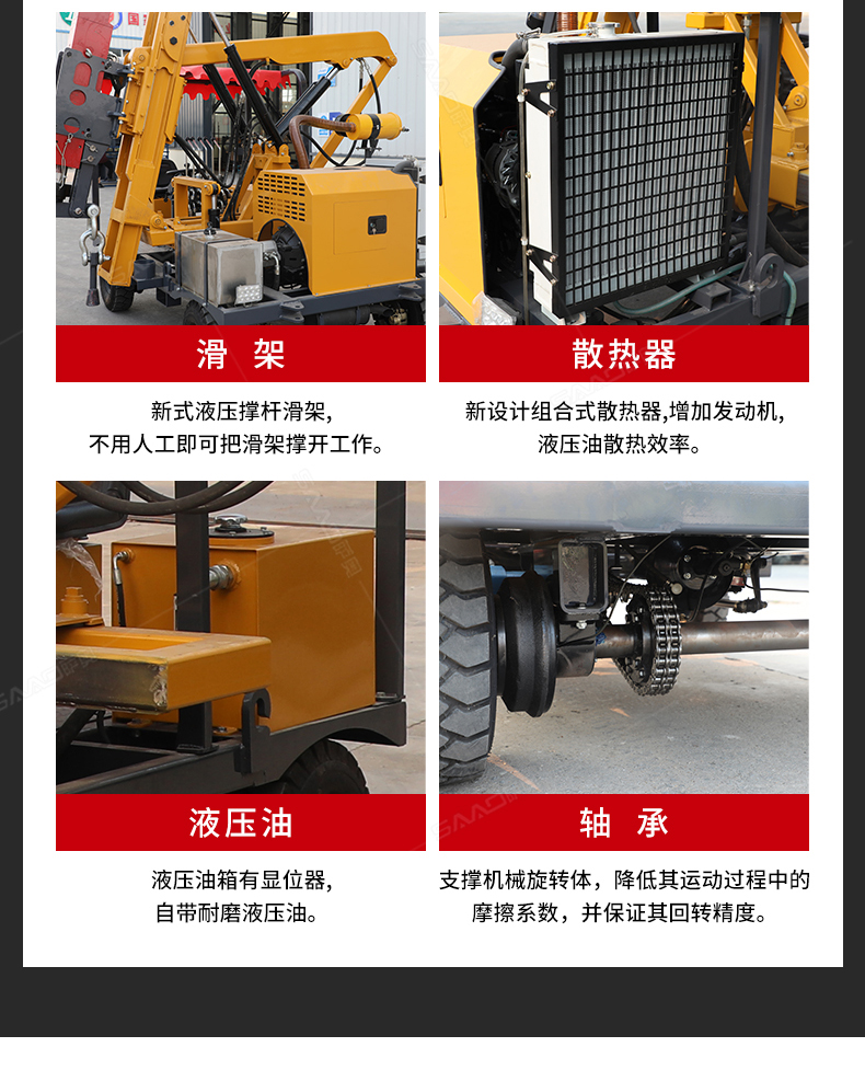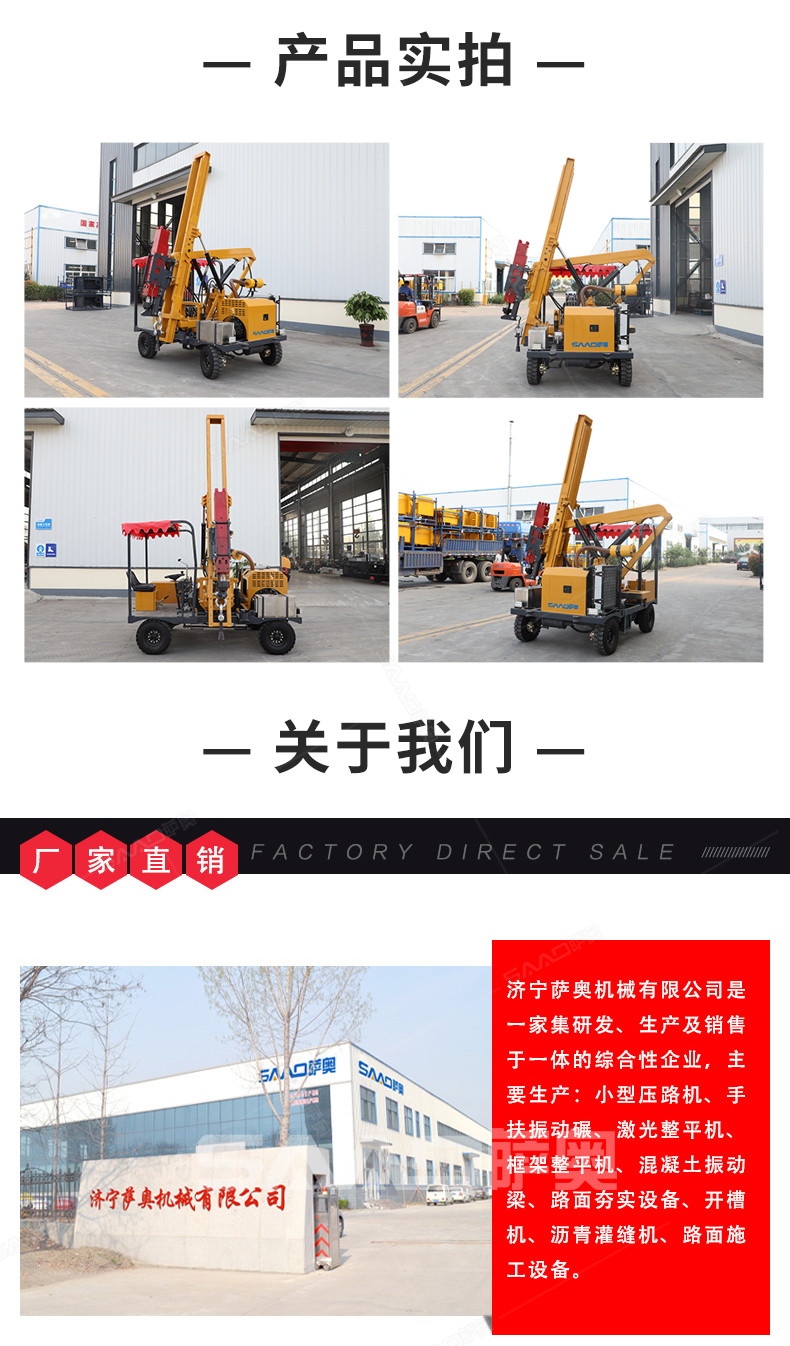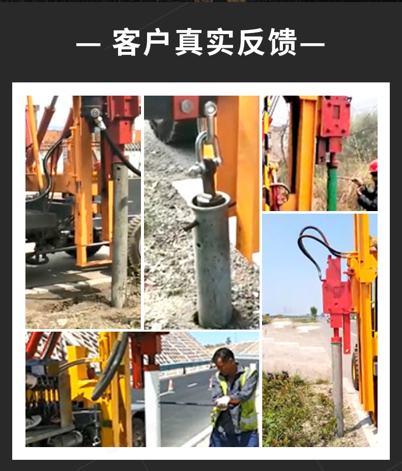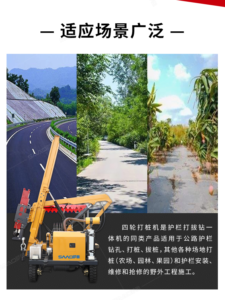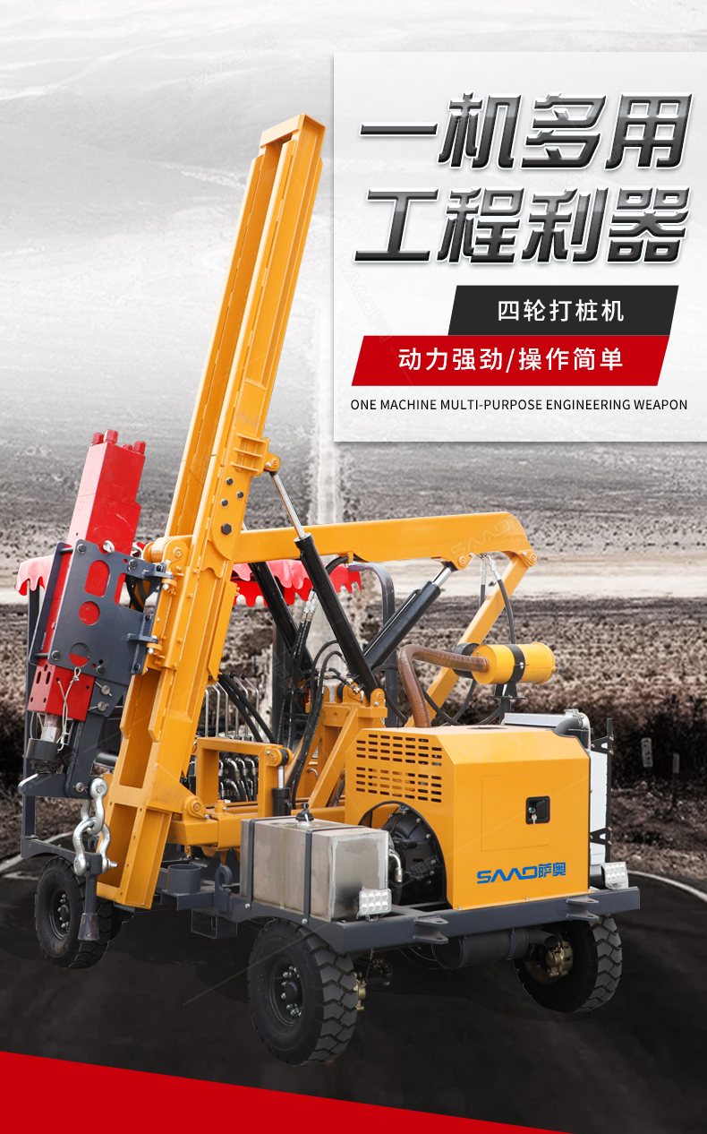 小四輪打樁機適用于公路護欄鉆孔、打樁、拔樁,其他各種場地打樁(農場、園林、果園),公路野外工程施工。