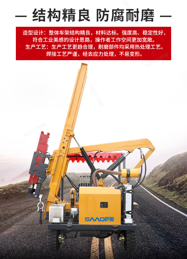 小四輪打樁機是護欄打拔鉆一體機的同類產品,也是用于公路波形護欄的安裝。該機采用柴油動力,全液壓機械傳動,具有行駛輕便、打樁精度高、經久耐用、節(jié)能環(huán)保等特點,特別適用于公路護欄安裝、維修和搶修的野外工程施工。