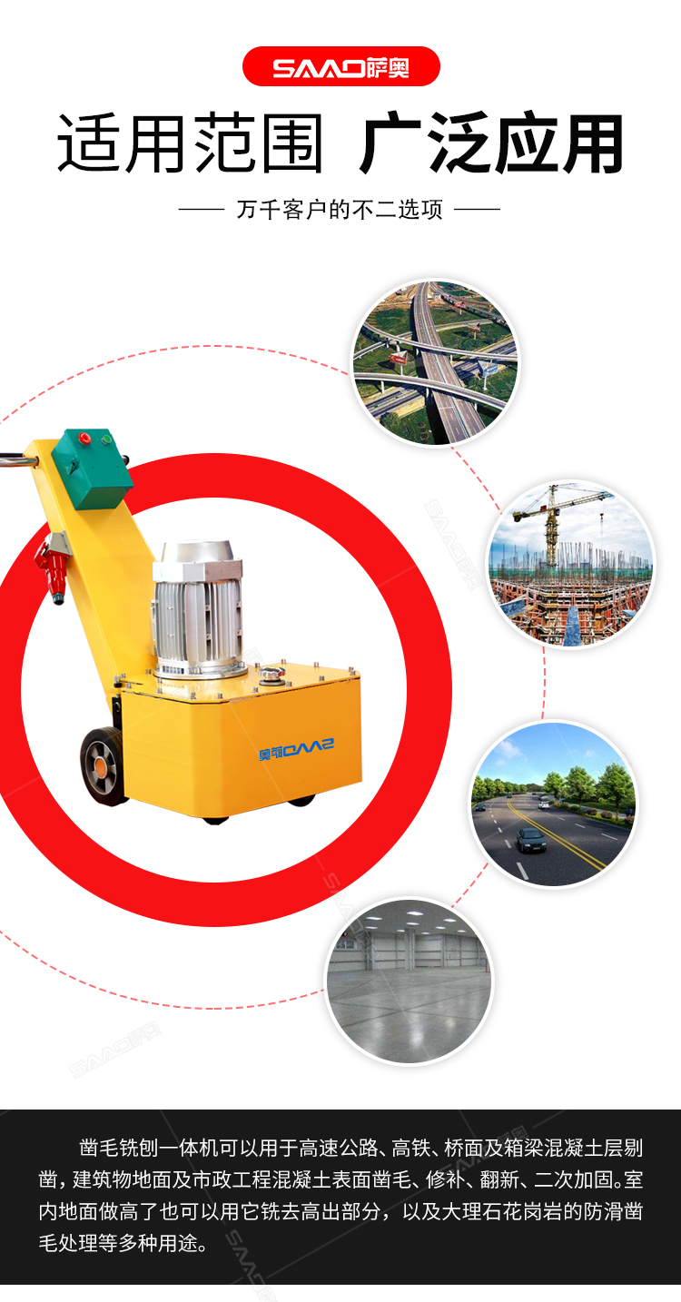 一、產品簡介: 鑿毛銑刨一體機,不需要空壓機,純電動,主要用于高速公路,高鐵,橋面及箱梁混凝土面層剔鑿,建筑物地面及市政工程混凝土表面鑿毛,修補,翻新,二次加固。室