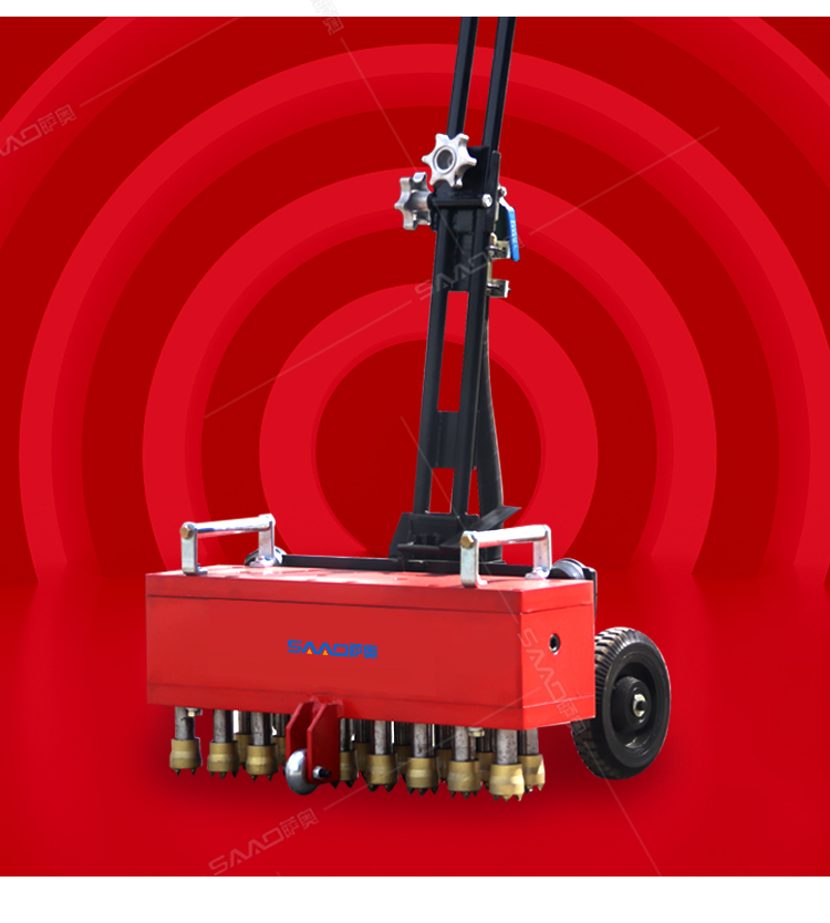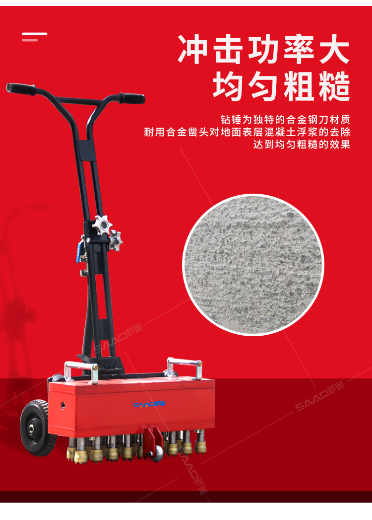 手推式地面鑿毛機,主要為高速公路、高速鐵路的橋面、機場、橋梁、停車場等各種混凝土地面新建鋪裝時對地面表層混凝土浮漿的去除,達(dá)到均勻粗糙而設(shè)計的。對各種陳舊地面做翻