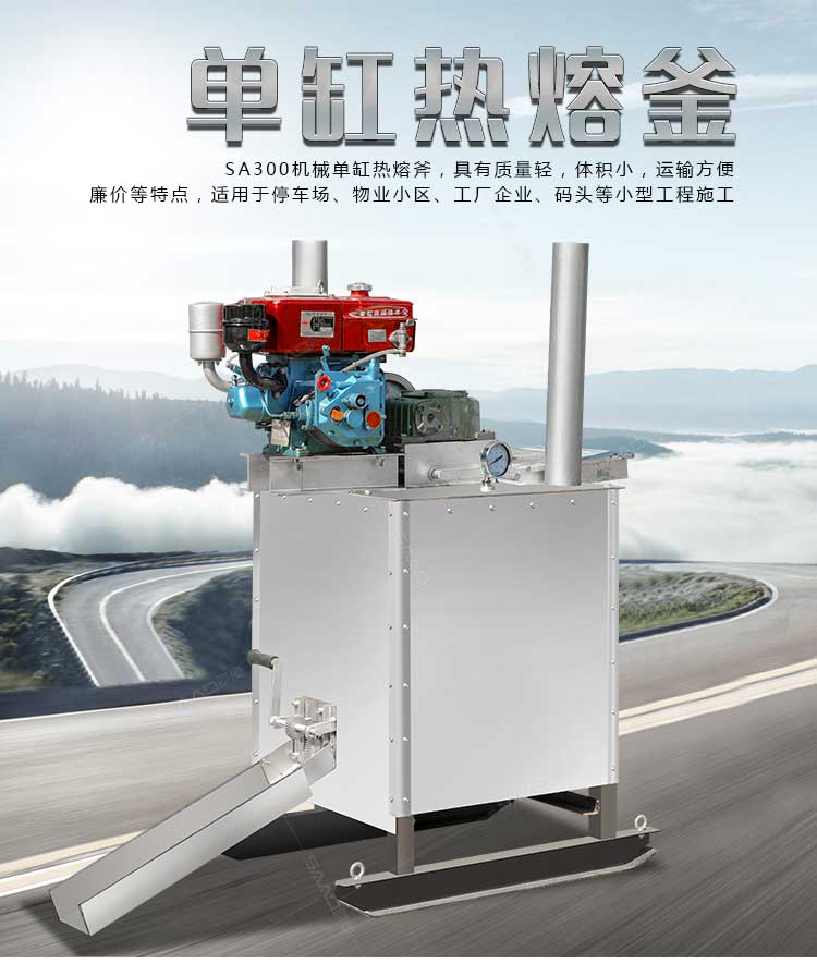 SA300機械單缸熱熔斧,具有質量輕,體積小,運輸方便、廉價等特點,適用于停車場、物業小區、工廠企業、碼頭等小型工程施工。 產品參數: 引擎:6.6PS柴油發動機 釜缸容量:350升缸