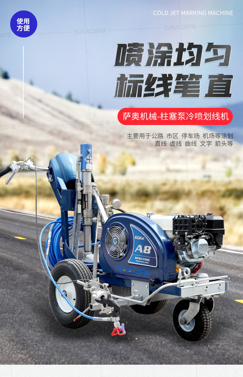 主要用于公路、市區、停車場、機場等涂劃直線、虛線、曲線、文字、箭頭等。具有劃線效果好、速度快、效率高、適用范圍廣、使用方便等優點。