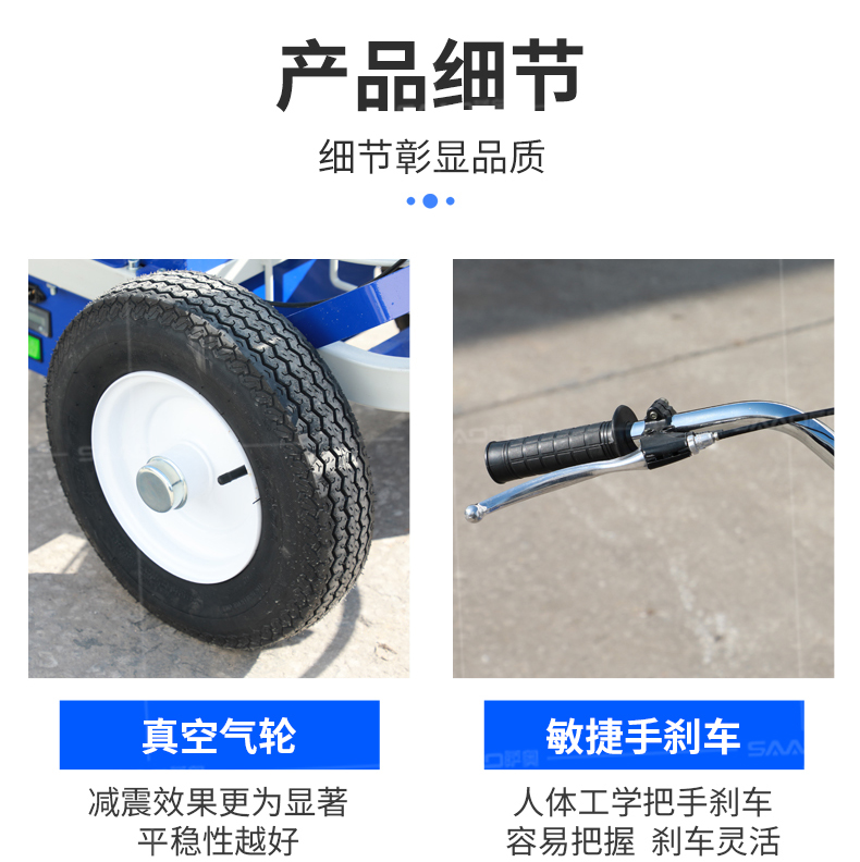 【產品介紹】 小區物業、地下車庫、學校、加油站、駕校場地等噴涂工作量不是特別大的客戶 【產品優勢】 持久續航,運行穩定,劃線筆直,無噪音。 真空氣輪:減震效果更為顯著平
