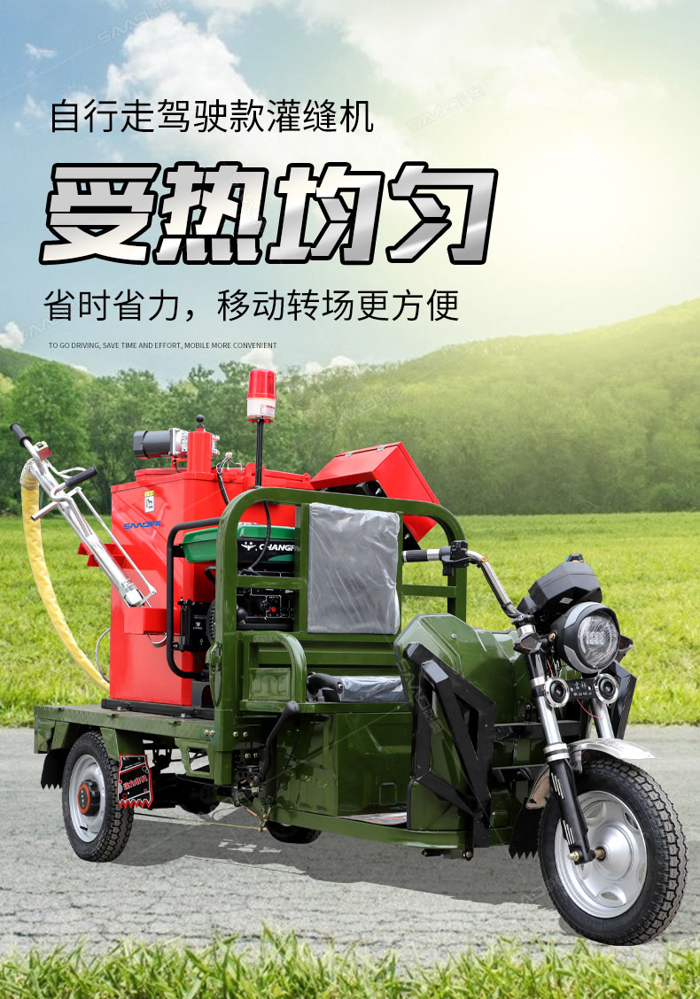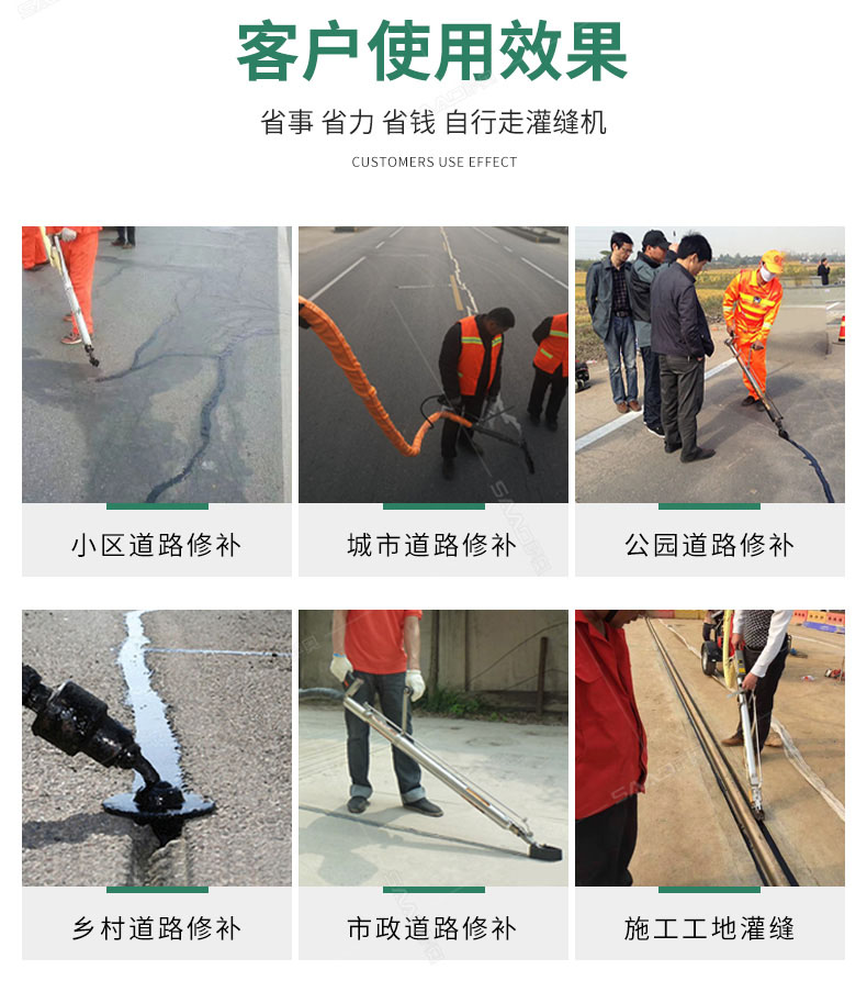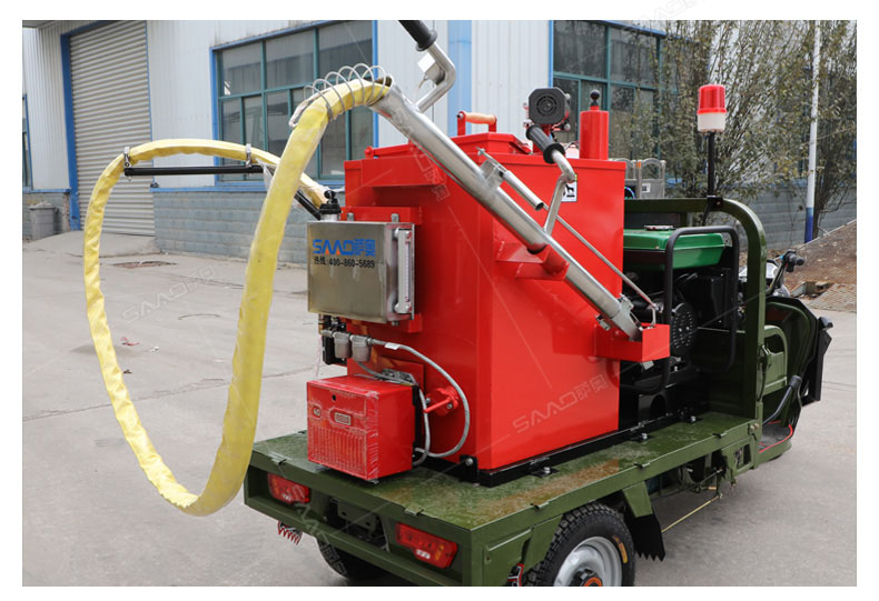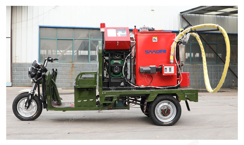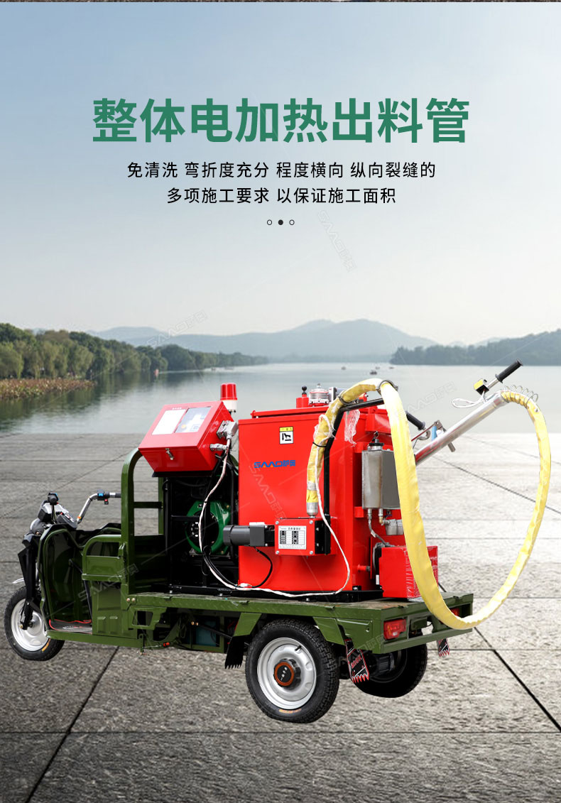 汽油灌縫機(jī)主要有手推式和自行式手持灌縫管操作,采用進(jìn)口柴油燃燒器加熱。在工作時(shí)首先在料箱內(nèi)加入瀝青或灌縫膠,啟動(dòng)發(fā)電機(jī)供電,依次間斷打開(kāi)導(dǎo)熱油泵開(kāi)關(guān),燃燒器開(kāi)關(guān),出料管加熱開(kāi)關(guān);調(diào)整自動(dòng)溫控系統(tǒng)與材料的溫度相同,通過(guò)柴油燃燒器自動(dòng)加熱熔料箱內(nèi)導(dǎo)熱油開(kāi)始升溫(拖式為強(qiáng)制循環(huán))使材料融化,溫度是通過(guò)自控系統(tǒng)來(lái)控制。溶料時(shí)間大約30-40分鐘左右。在材料融化、出料管溫度達(dá)到后可以進(jìn)行工作。手持灌縫管對(duì)正裂縫灌縫處理。瀝青泵的出料流量可調(diào)。在工作過(guò)程中隨時(shí)添加材料保證工作的連續(xù)性。
