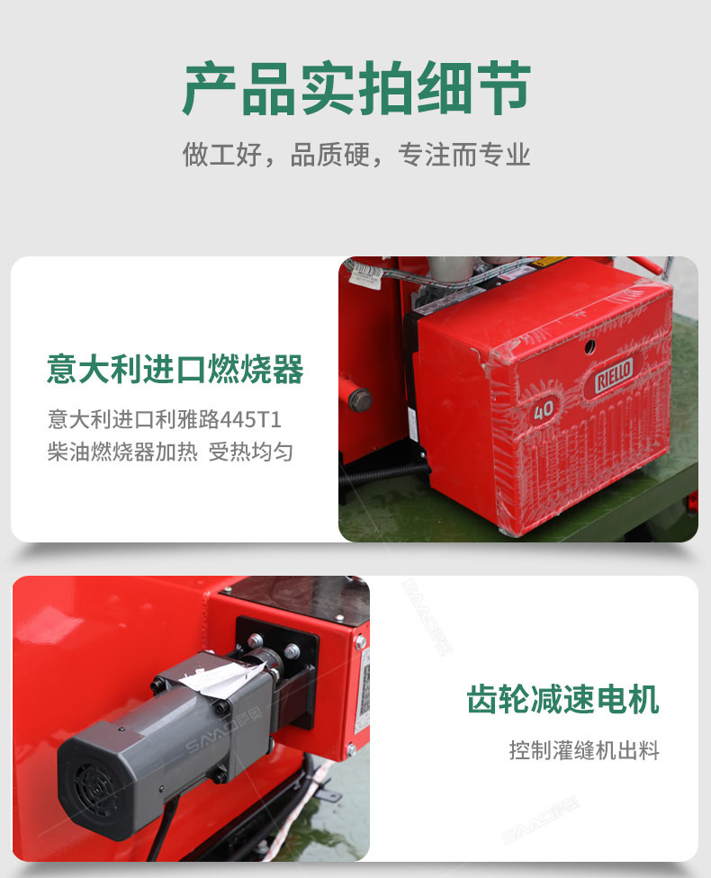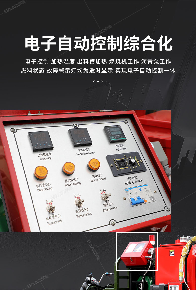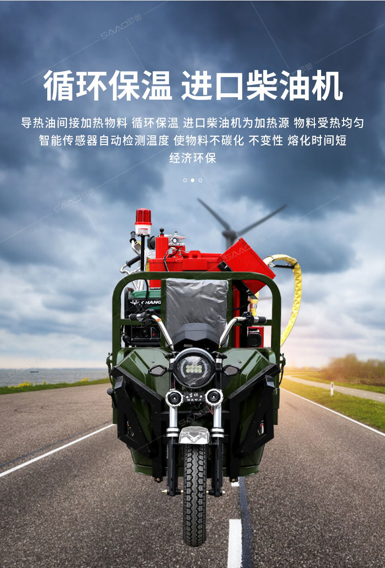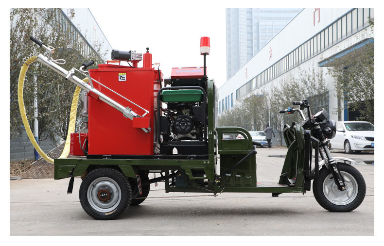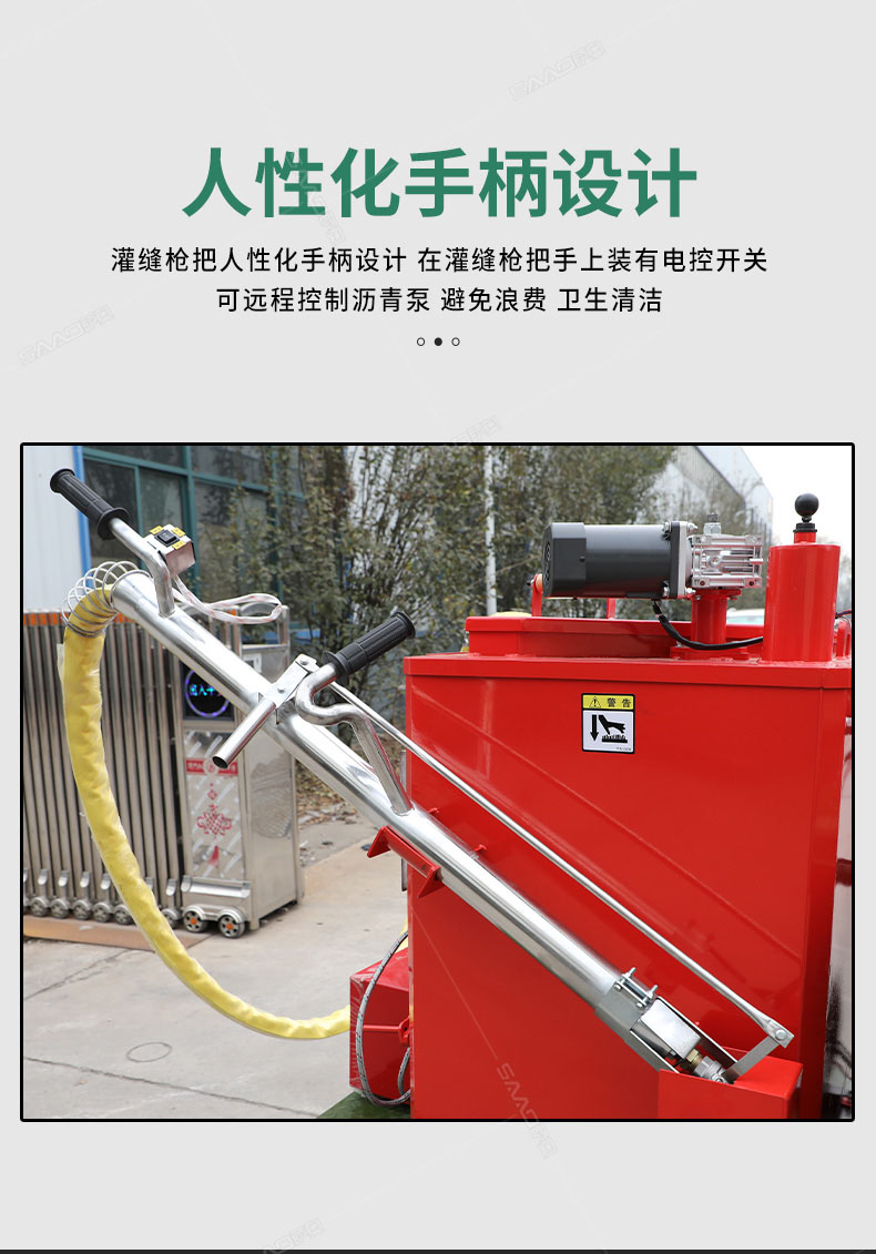 汽油灌縫機(jī)主要有手推式和自行式手持灌縫管操作,采用進(jìn)口柴油燃燒器加熱。在工作時(shí)首先在料箱內(nèi)加入瀝青或灌縫膠,啟動(dòng)發(fā)電機(jī)供電,依次間斷打開(kāi)導(dǎo)熱油泵開(kāi)關(guān),燃燒器開(kāi)關(guān),出料管加熱開(kāi)關(guān);調(diào)整自動(dòng)溫控系統(tǒng)與材料的溫度相同,通過(guò)柴油燃燒器自動(dòng)加熱熔料箱內(nèi)導(dǎo)熱油開(kāi)始升溫(拖式為強(qiáng)制循環(huán))使材料融化,溫度是通過(guò)自控系統(tǒng)來(lái)控制。溶料時(shí)間大約30-40分鐘左右。在材料融化、出料管溫度達(dá)到后可以進(jìn)行工作。手持灌縫管對(duì)正裂縫灌縫處理。瀝青泵的出料流量可調(diào)。在工作過(guò)程中隨時(shí)添加材料保證工作的連續(xù)性。