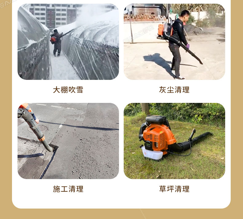 本機(jī)適用于修公路吹灰塵和吹雪,吹雪厚度達(dá)到15公分以上,鐵路上吹沙子,萊大柵溥膜上和露天的變壓器上吹雪(露天變壓器上吹雪時(shí),需再配2.8米的伸縮噴風(fēng)管)。公園內(nèi)吹落葉,院