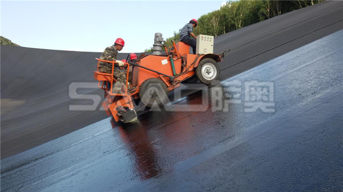 瀝青封閉層的施工采用適合于斜坡施工的專用瀝青瑪蹄脂涂刷機,在牽引臺車的牽引下沿著面板從下往上涂刷。涂刷完一個條帶后,將涂刷機移動至下一個條帶繼續涂刷?,斕阒忾]層涂刷作業時環境氣溫應在10℃以上,涂刷溫度一般在170℃~190℃;施工完成的封閉層表面禁止無關人員和機械行走;特殊部位:壩頂及曲率半徑較小的圓弧斷,采用小型機械涂刷方式進行機械涂刷進行,環庫水平段及弧段全部采用小刮涂機配合人工進行刮涂施工。