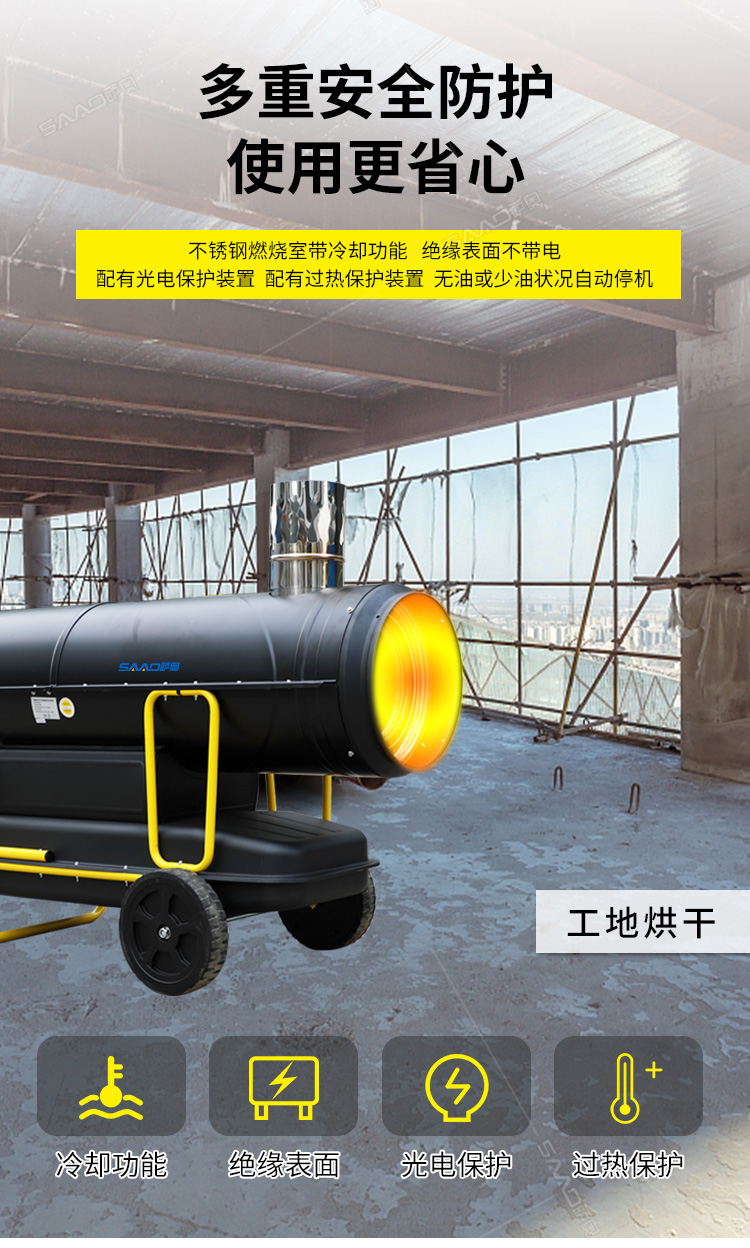 間燃暖風機的應用范圍可以說是非常廣泛的,主要可以應用于大棚育植、食品烘干、茶葉烘干、育雛養殖、 木材解凍、戶外演出等需要供暖供熱的場所,此外,配有光電保護裝置、結構
