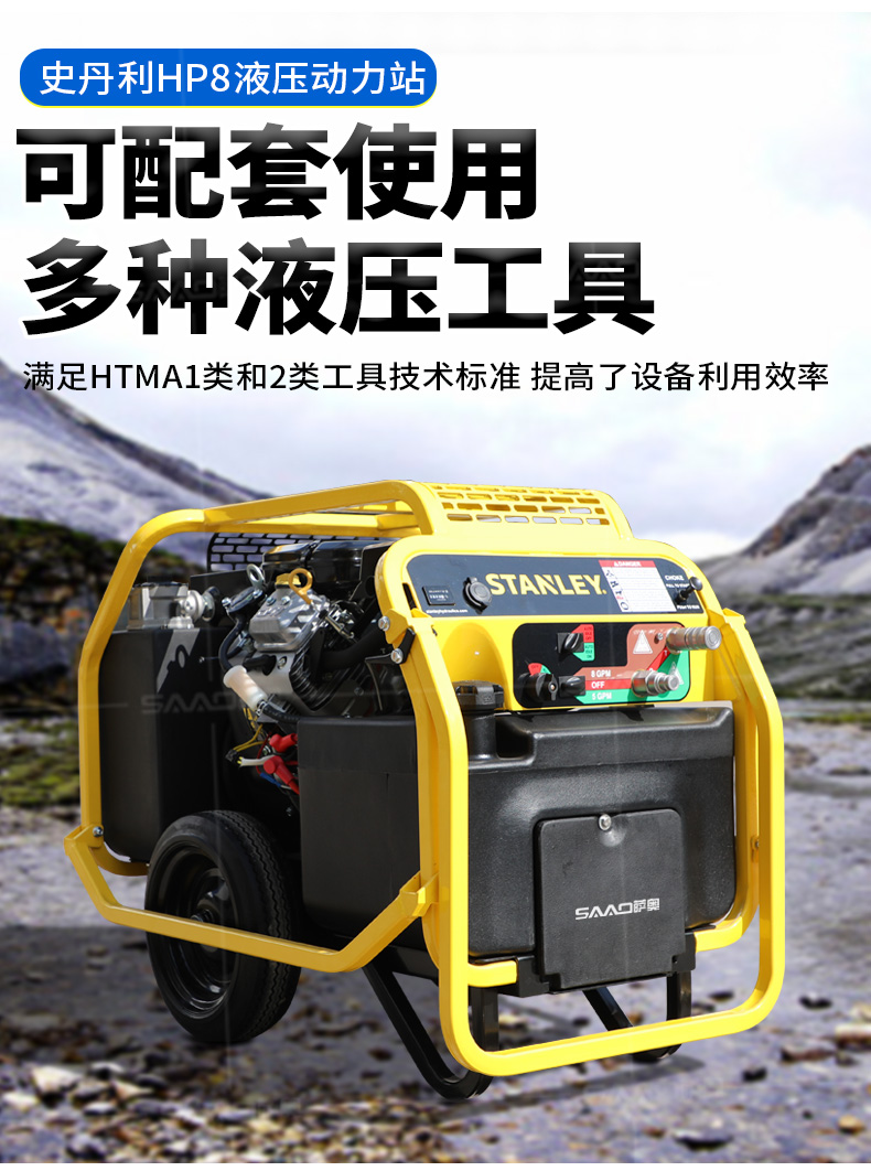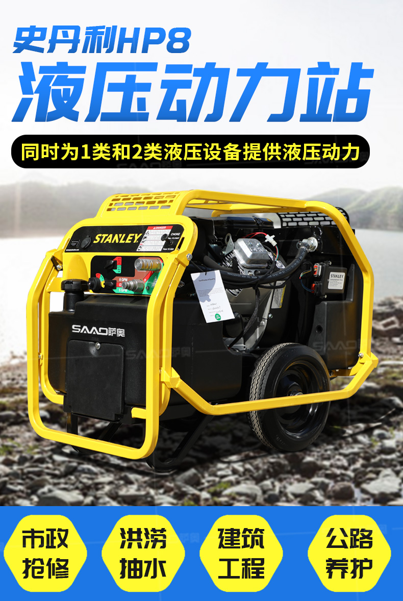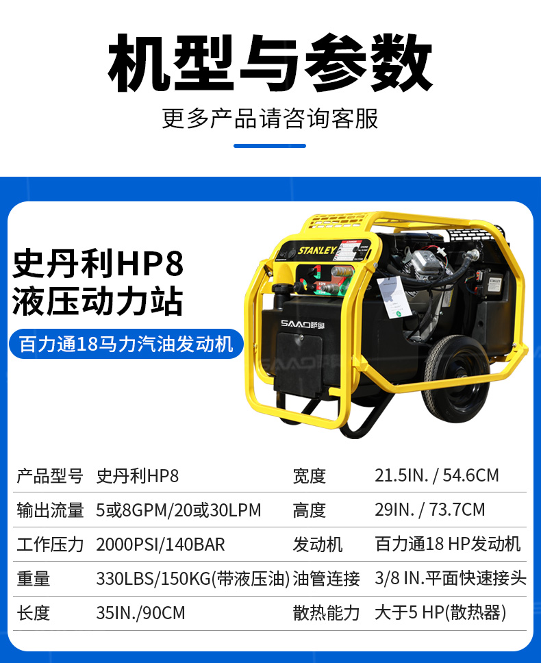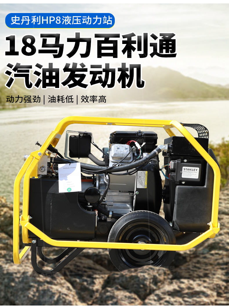 HP8動力站是為液壓設備提供持續動力的,它同時滿足1類和2類液壓設備。它采用百力通18馬力 汽油發動機,有良好的液壓油散熱系統,以滿足液壓設備可以正常、持久地工作。